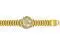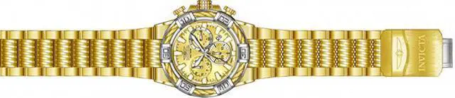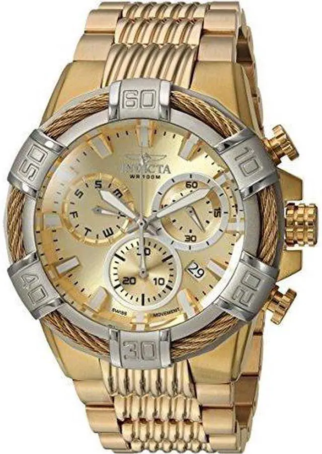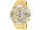 Gold dial Chronograph with 60 sec, 30 min and day sub dials with date display, Gold tone rope accent on bezel, Gold tone stainless steel band, Push down crown, 51MM stainless steel case with flame fusion crystal, Quartz