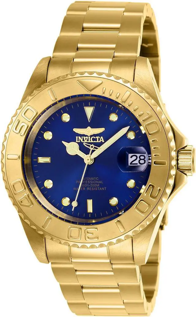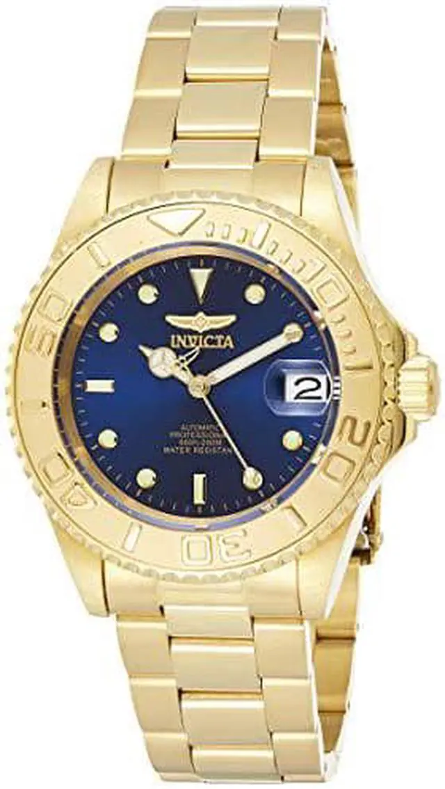 Plunge into any horizon using the steadfast guidance of the Invicta Pro Diver. This beautiful timepiece begins with a gold plated stainless steel case that surrounds a blue dial with luminous hands and dot hour markers, and magnified date window at 3 o'clock position. It's protected by flame mineral and powered by Automatic movement. A gold plated stainless steel bracelet secure this watch to the wrist, while a fold-over clasp ensures its secure placement. Finally, this watch boasts of water resistance up to 200 meters / 660 feet. Round blue dial Luminous hands and dot hour markers Magnified date window at 3 o'clock Gold plated stainless steel case Unidirectional bezel Screw down crown Scratch resistant mineral crystal Stainless steel bracelet with fold-over clasp Swiss quartz movement Water resistance up to 300 meters/660 feet