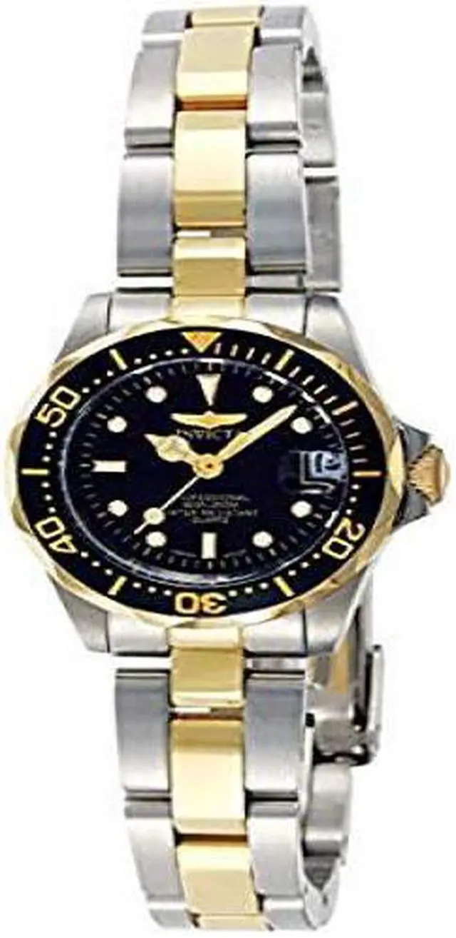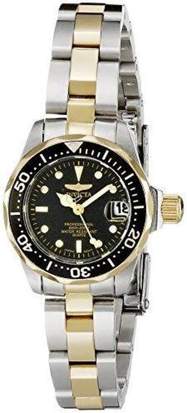 Classically styled for the sporty lady, this two-tone, mid-sized Invicta stainless steel women's watch travels easily between professional environs and weekend adventures. It features water resistance to 200 meters (660 feet), which is suitable for recreational diving, and a stylish, black unidirectional rotating bezel with gold engraved elapsed time markings. The black dial includes Tritnite luminous dotted markers and stylized hands (with seconds hand), small minute indexes, and a date window at 3 o'clock. Other features include a handsome stainless steel bracelet band with a fold-over safety clasp, anti-reflective mineral crystal, and Japanese quartz movement.