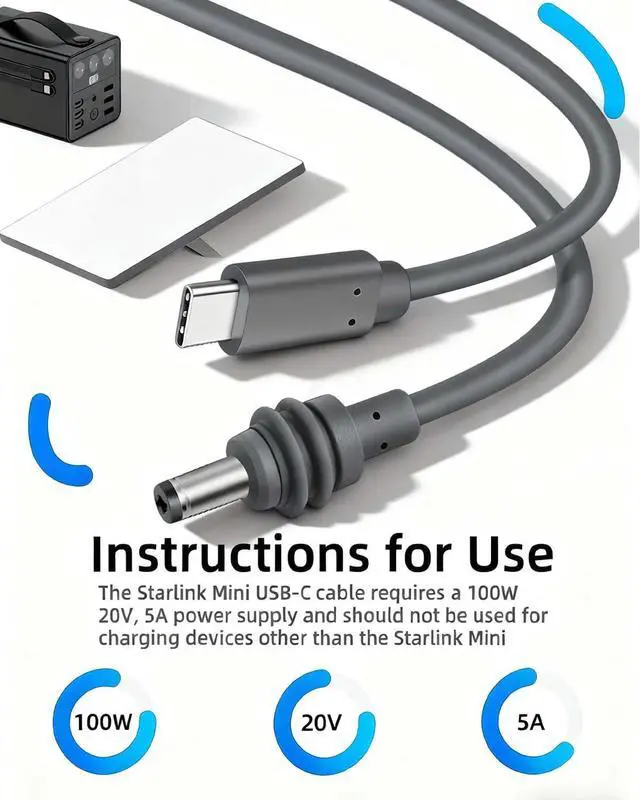 Instructions: Only applicable to Starlink mini. The starlink usb c power cable requires a 100W 20V 5A power source.This Starlink mini cable can be combined with Starlink Mini Suction Cup Mount and Starlink Mini Case.