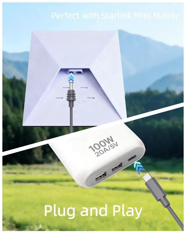 Easy Plug & Play Setup Connect USB-C to a PD power bank and DC to Starlink Mini. No extra adapters or installation required.