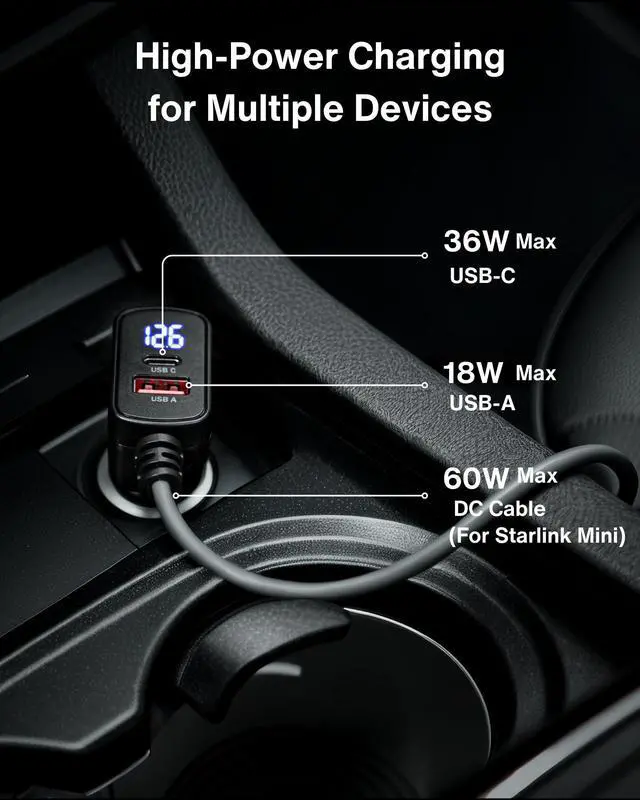 Car Charger Cable for Starlink Mini 6.5FT with Display - 12-24V Cigarette Lighter to DC Power Cable, 60W DC + 33W Dual USB-C/USB-A Adapter for Trucks, RVs & Boats, 18AWG Cord with Voltage Monitoring