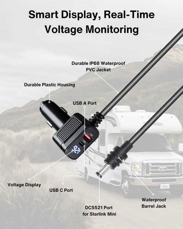 • Durable 6.5FT 18AWG Cable Durable Plastic Housing for Maximum Protection: Featuring a heavy-duty 6.5FT 18AWG cable, this Starlink Mini charging cable is designed to withstand extreme temperatures, UV exposure, and rugged outdoor use. The durable plastic housing shell ensures durability and longevity, making it the perfect Starlink Mini car charger cable for off-grid adventures.