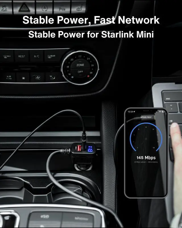 • Dual USB-C & USB-A Ports Fast 33W Charging for Extra Devices: Equipped with USB-C and USB-A ports, this Starlink Mini car adapter supports 33W fast charging, allowing you to charge your smartphone, tablet, or other essential devices while powering your Starlink Mini. No need to carry extra adaptersthis is your all-in-one car charger solution.
