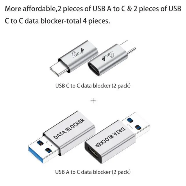 Luarxsin USB Data Blocker is an essential security tool that allows you to charge your mobile devices safely at public charging stations, preventing data leakage and blocking any unauthorized data transfer or syncing. This compact and portable usb c data blocker supports fast charging technology.Available in a pack of four, including two USB A to C and two USB C to C blockers, it is suitable for a range of devices from iPhones to Mac-Books. Its transparent case design adds a stylish visual appeal, making it perfect for on-the-go use, ensuring your devices are charged without risk wherever you are.