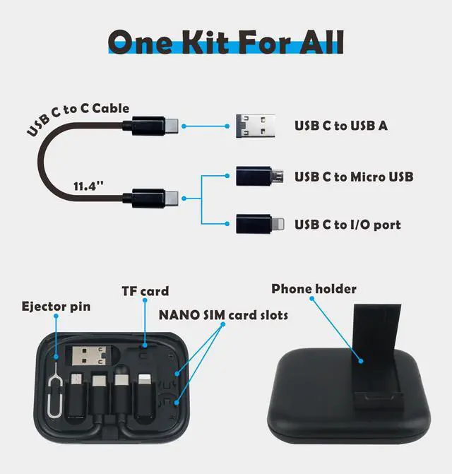 This travel essential kit includes one USB-C to C cable and three adapter connecters, 1 cable + 3 adapters = all cables you need (Micro USB, Light, USB-C).