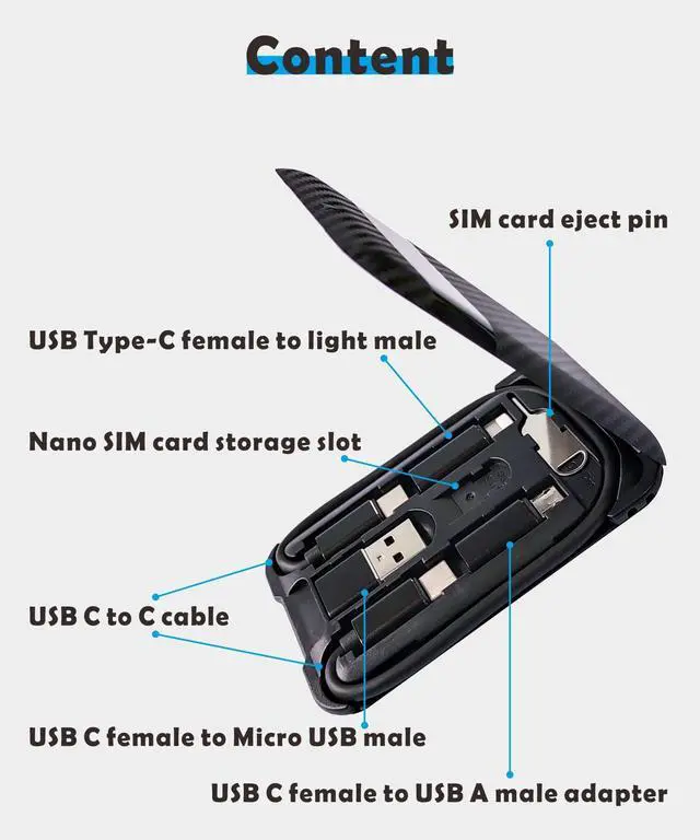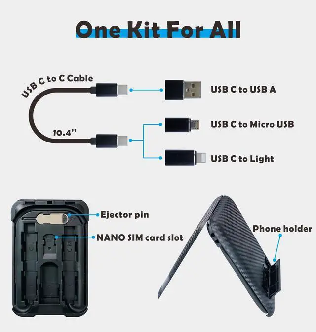 This travel essential kit includes one USB-C to C cable and three adapter connecters, 1 cable + 3 adapters = all cables you need(Micro USB, I/O port, USB-C).
