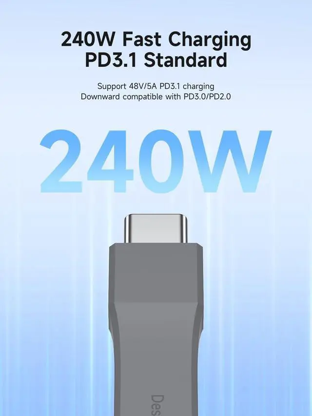 240W Fast Charging: Built-in E-marker chip, PD 3.1 standard supports 240W fast charging, while it is backward compatible with PD3.0 and 2.0 protocols,Supports high power output of up to 48V5A. And also compatible with 140/100/60W power devices. Charge USB C devices from phones to laptops