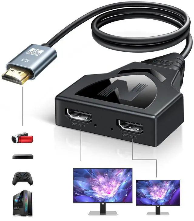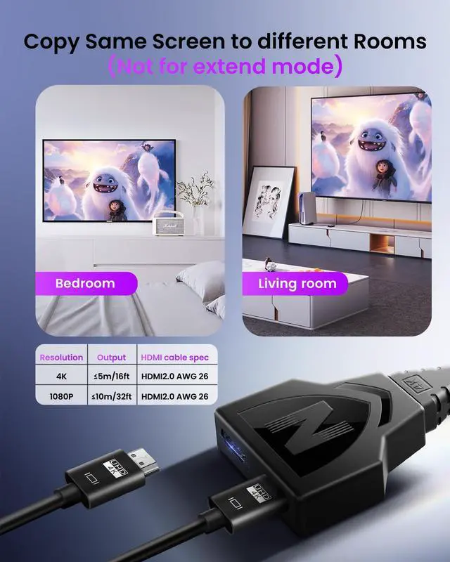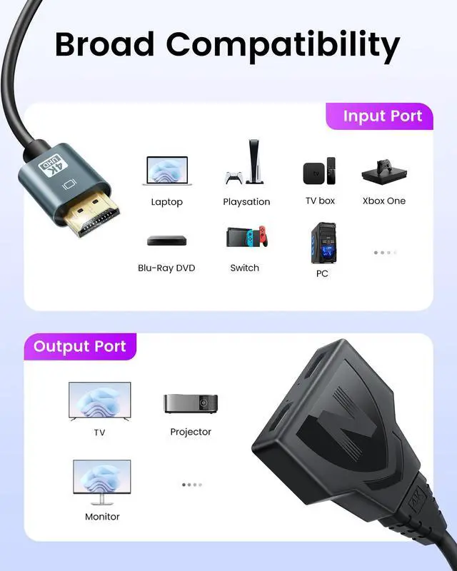 4K UHD Visual Experience: HDMI 1 in 2 Out Cable supports 4K@30Hz, 1080P@60Hz, and 3D video with 8/10/12-bit color. Enjoy stable transmission up to 16ft for 4K and 32.8ft for 1080P. For optimal signal clarity, high-quality AWG26 HDMI 2.0 cables are highly recommended.