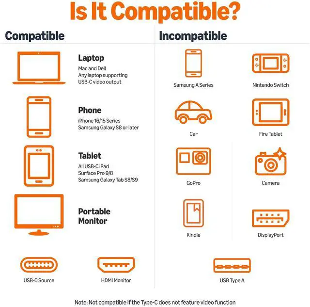 Connects USB-C devices such as phones, tablets, and laptops to digital output devices; hosts USB-C port requires to support Displayport Alt Mode (Video function enabled) to view video over USB-C (not all USB-C ports support Alt Mode functionality)