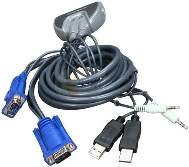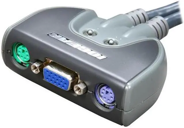| Features | The smallest 2-port KVM switch available with audio support Use one keyboard, monitor and mouse to control two computers Share multimedia speakers among two computers 6’ long molded-in cables to simplify setup Support for Microsoft Intellimouse, Logitech FirstMouse+, MouseMan+, and most PS/2 mice PS/2 mouse emulation for error-free boot-up Saves space and reduces desktop clutter Plug-n-Play monitor support No software required Built in AutoScan mode LEDs allow for easy status monitoring |