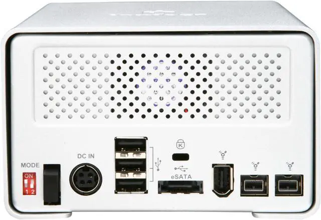 The 34497 has a three-port USB 2.0 hub as well as three FireWire ports for easy connectivity. Or, you can transfer files at a much faster speed with the 3Gb/s eSATA connection. In addition to acting as a large drive you can select the RAID 0 setting for higher data throughput or choose increased security with the redundancy features of RAID 1. The stackable design allows you to store more data in a very small footprint.