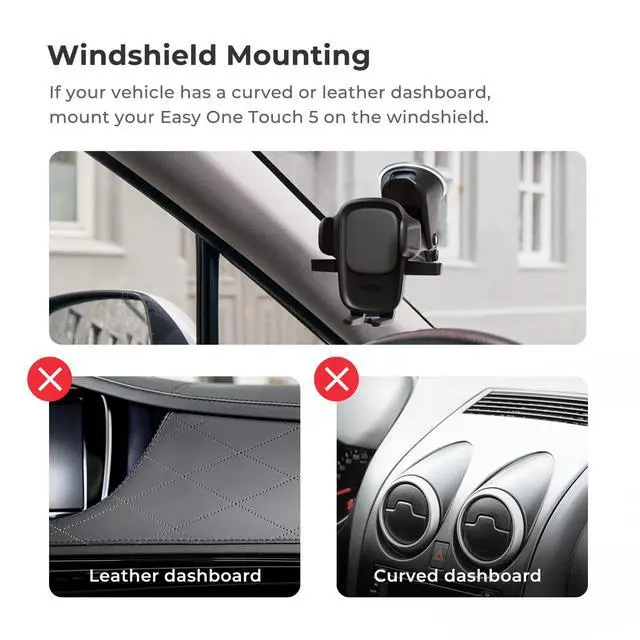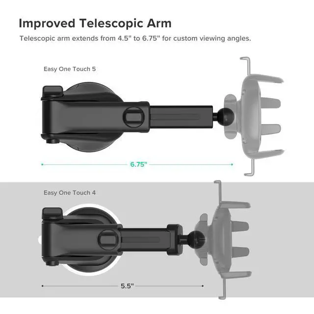 The Easy One Touch 5 Dash and Windshield Mount is the next generation of our best-selling, universal smartphone car mount. Engineered to safely enhance your driving experience, the Easy One Touch 5 features our unique Easy One Touch mechanism, which allows you to lock and release smartphones quickly with an easy one handed motion. Recognized for its superior quality and sleek design, the new Easy One Touch 5 series includes a new finish that complements modern automotive interiors.