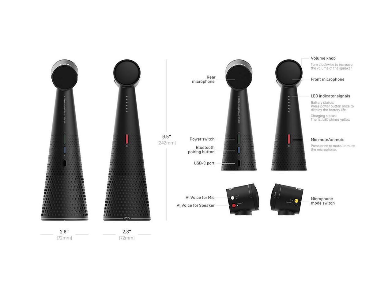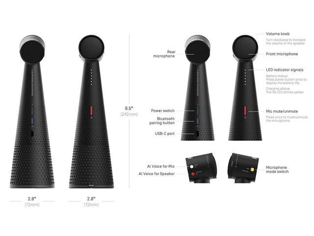 - Physical Control Buttons - Mic mute/unmute, Power switch, Bluetooth pairing button, volume knob, microphone mode switch - directional/omni, AI Voice for Mic, AI Voice for Speaker.