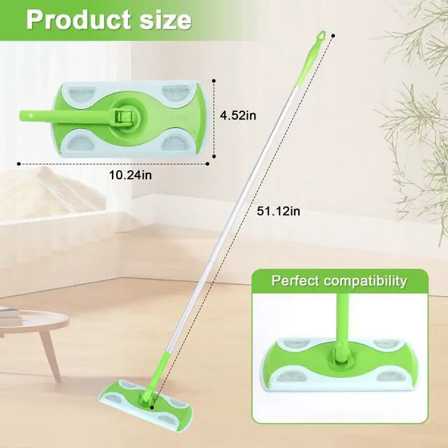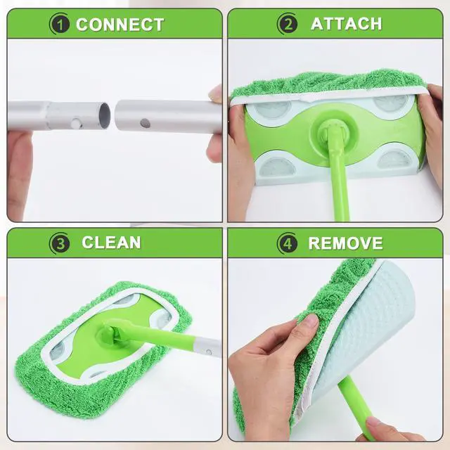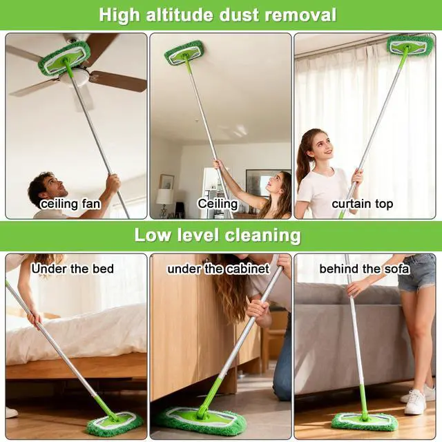 Product Specifications: Materials and Craftsmanship Pole: High-quality aluminum alloy with an oxidized surface for scratch resistance and durability Connector: Green, environmentally friendly reinforced nylon, durable and impact-resistant, BPA-free Handle: Ergonomic, soft-rubber, non-slip design for a comfortable and fatigue-free grip Dimensions and Weight Total Length: 4.26 feet (approximately 130 cm) Each section is approximately 35-40 cm long after disassembly, making it easier to store. Total Weight: Approximately 420 grams, lightweight and easy to hold Compatibility and Applicability Perfectly compatible with Swiffer Sweeper, Swiffer WetJet and other series mop heads Universal snap-on design with an audible click when installed. If there's no sound, rotate to ensure it's securely in place. Features Extended design: Extended cleaning coverage, easily reaching ceilings, under beds, and sofas. Quick disassembly: One-click detachment and compartmentalized storage for flexible travel and storage. Non-slip and durable: The grip is ribbed for non-slip performance, and the handle is rust-resistant and moisture-resistant for a long life. Suitable for daily household floor cleaning. High-level dust removal: Ceilings, ceiling fans, and curtain tops. Low-level cleaning: Under beds, under cabinets, and behind sofas. Suitable for a variety of indoor environments, including homes, offices, and dormitories.