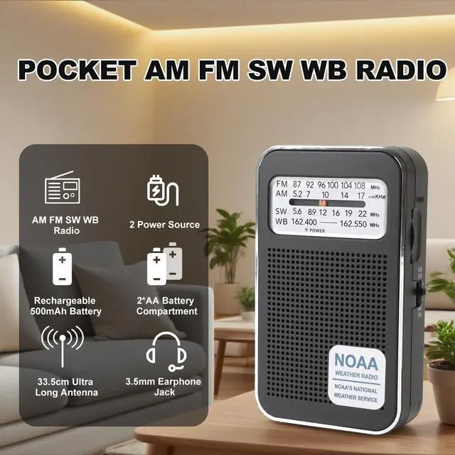 This compact and powerful transistor radio is your perfect companion for staying informed and entertained anywhere. As a reliable emergency radio, it ensures you're always connected with access to 4 bands: AM, FM, SW, and WB. Frequency range:AM (520-1710 Khz), FM (87-108MHz), SW (5.6-22MHz), WB (162.400-162.550MHz). These radios portable am fm are designed for clarity and convenience, operating as a dependable battery radio that's ready for anything, whether at home or on the go.