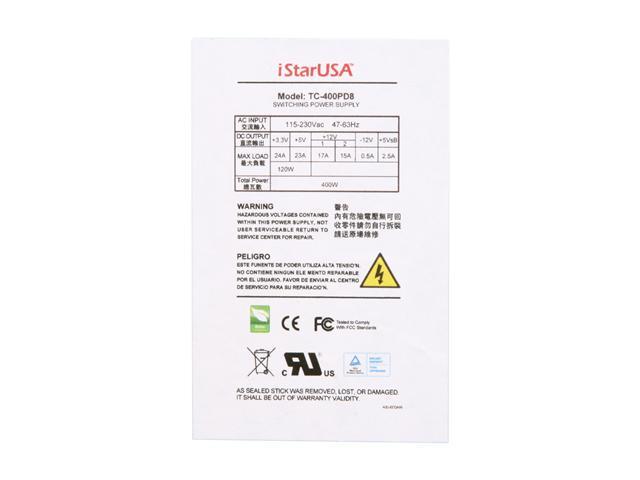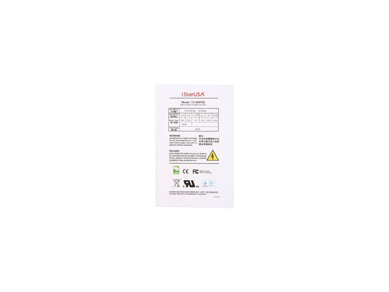 iStarUSA TC-400PD8 20+4Pin 400W Single PS2 ATX High Efficiency Switching Server Power Supply - OEM
