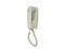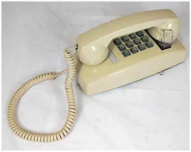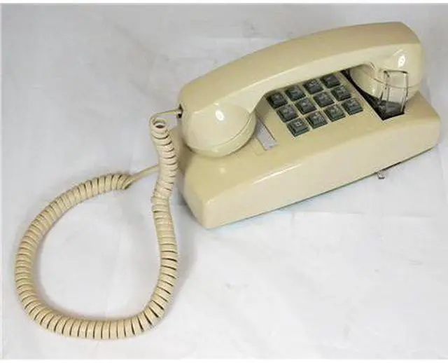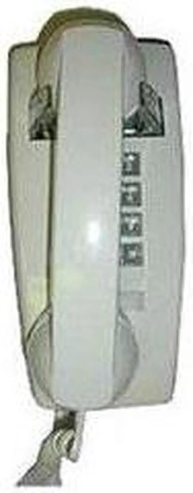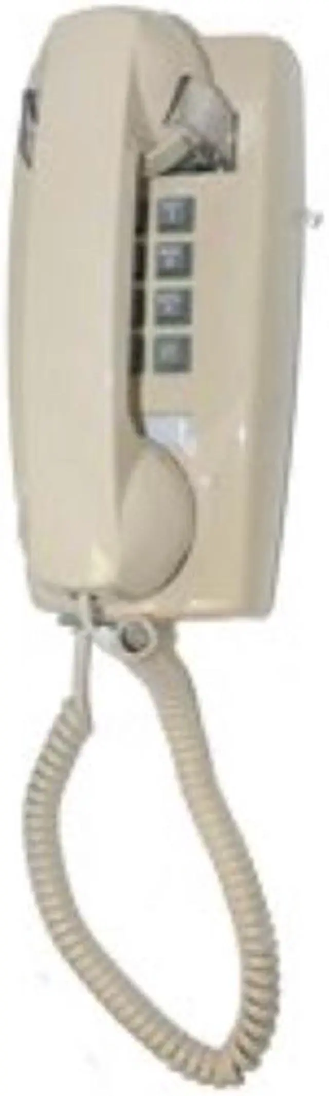 Cortelco traditional mini-wall phone, Tone dial, Single-gong ringer, Ringer volume control, Handset volume control dial on handset, Slide-mount (connector is male, fits directly onto a wall mount jack without need for a 3' line cord, see also SE-630LCCU-50, a wall jack with built-in DSL filter), Cream with gray buttons, ITT2554VIV