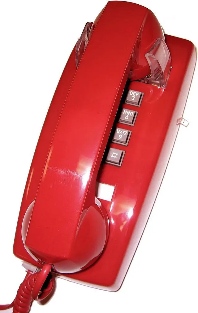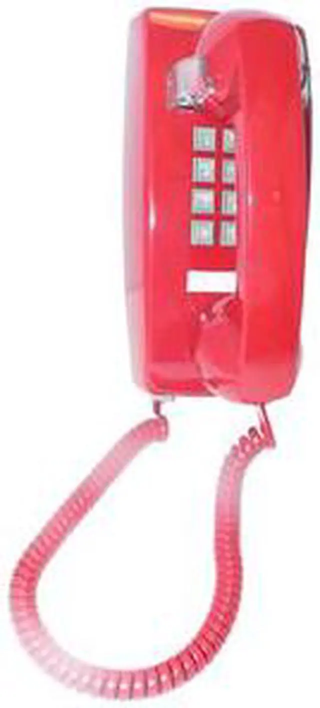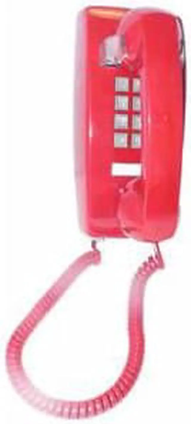 Cortelco traditional mini-wall phone, Tone dial, Single-gong ringer, Ringer volume control, Handset volume control dial on handset, Slide-mount (connector is male, fits directly onto a wall mount jack without need for a 3' line cord, see also SE-630LCCU-50, a wall jack with built-in DSL filter), Red with gray buttons, ITT2554VRD.