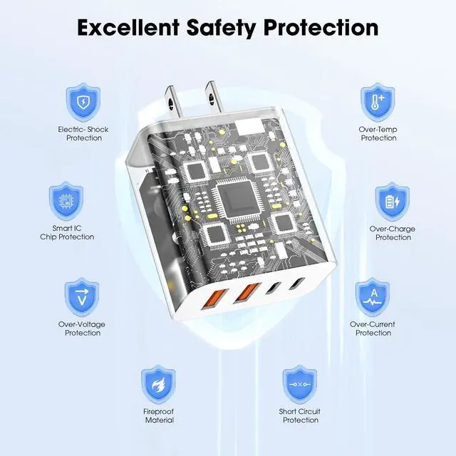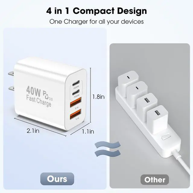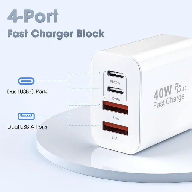 USB C Charger Block This USB C wall charger delivers true fast charging block performance with 40W PD3.0 (USB-C) + 40W QC4.0 (USB-A). Charges your iPhone 17/16/15 Pro Max to 60% in just 30 minutes - 3x faster than standard Apple charging blocks.