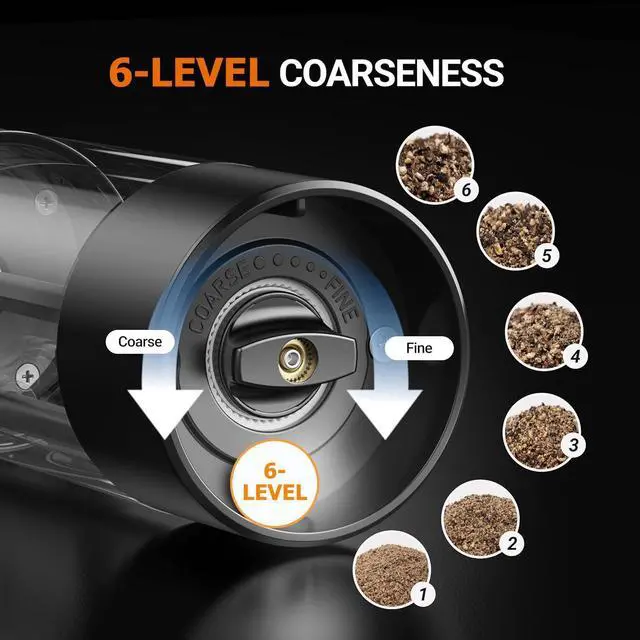 Large Capacity & Clear BodyThe bottom of the electric salt and pepper shakers is made of transparent acrylic material, allows you to easily see the remaining spices and distinguish between different seasonings. The capacity is 90 ml, No need to add spices frequently.