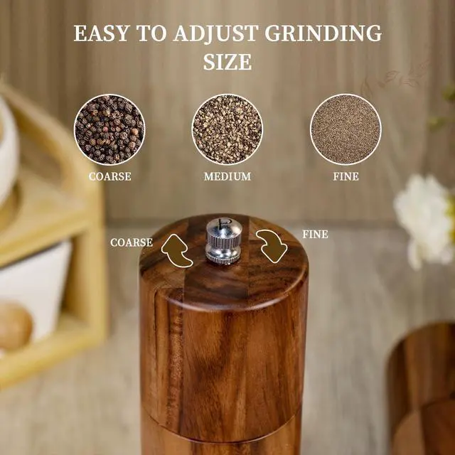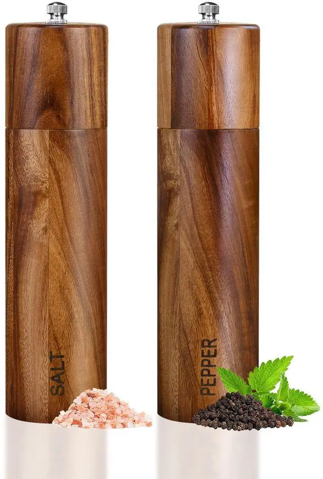 - From seasoning your morning eggs to enhancing the flavor of dinner dishes, the Acacia Wood Salt and Pepper Grinder Set ensures fresh, flavorful results every time. Whether you're making a gourmet meal or a quick snack, the adjustable grind settings and smooth operation meets satisfaction.