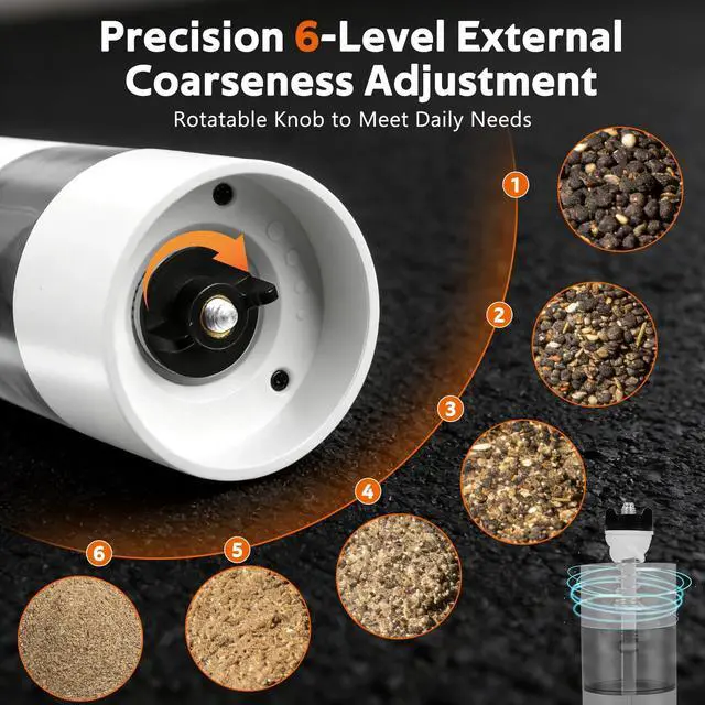 6-Level Professional Grind ControlDesigned for those who appreciate precision. With an external coarseness dial offering 6 distinct settings, this pepper grinder delivers restaurant-quality results right at home. From fine sea salt to coarse peppercorns, achieve the perfect texture for every dishwhether its a weeknight dinner or a festive holiday feast.