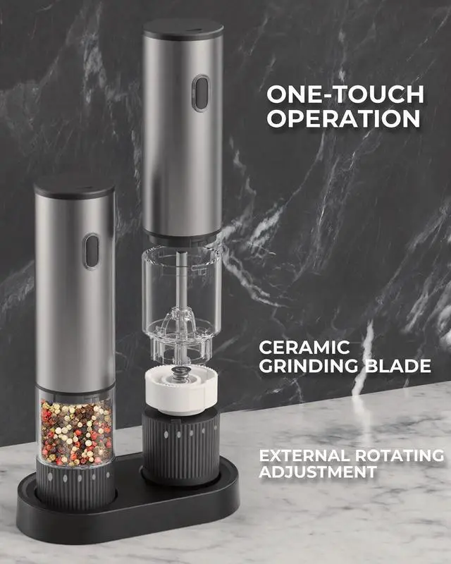Rechargeable for Daily ConvenienceOur electric salt and pepper grinder set comes with a built-in rechargeable battery, eliminating the need for disposable batteries. Simply recharge and enjoy consistent grinding every timean ideal upgrade to your rechargeable salt and pepper grinder set collection