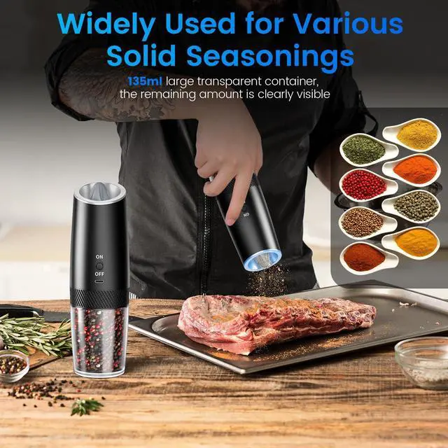 [Large Capacity & One-Handed Operation] Designed for convenience, MealHelper salt & pepper grinder has an upgraded capacity of 135ml, which holds more salt or pepper than traditional grinders, resulting in less frequent refilling. The gravity-sensitive design enables one-handed operation, simply turn the grinder over and enjoy freshly ground spices without the need to manually grind or press buttons, allowing you to effortlessly add seasoning while freeing up your other hand - a great essential tool for busy kitchens and outdoor enthusiasts