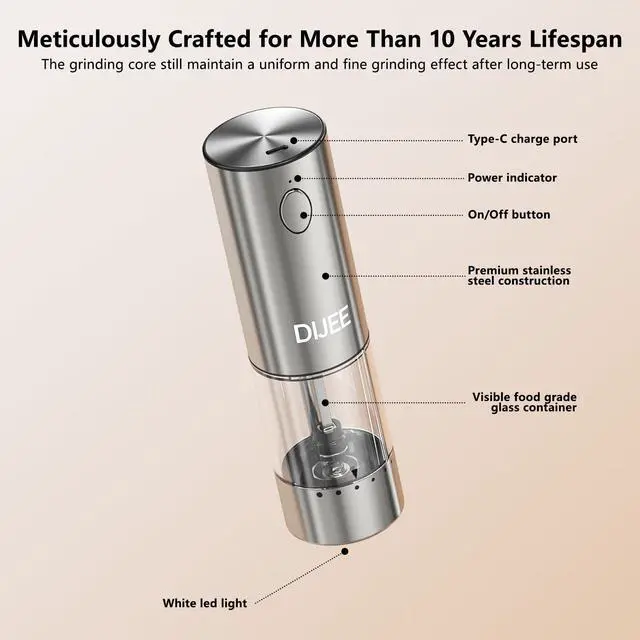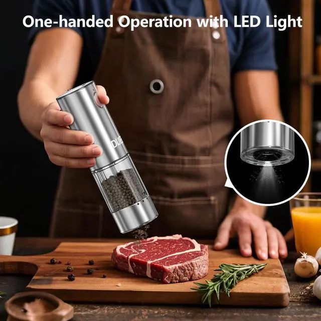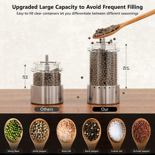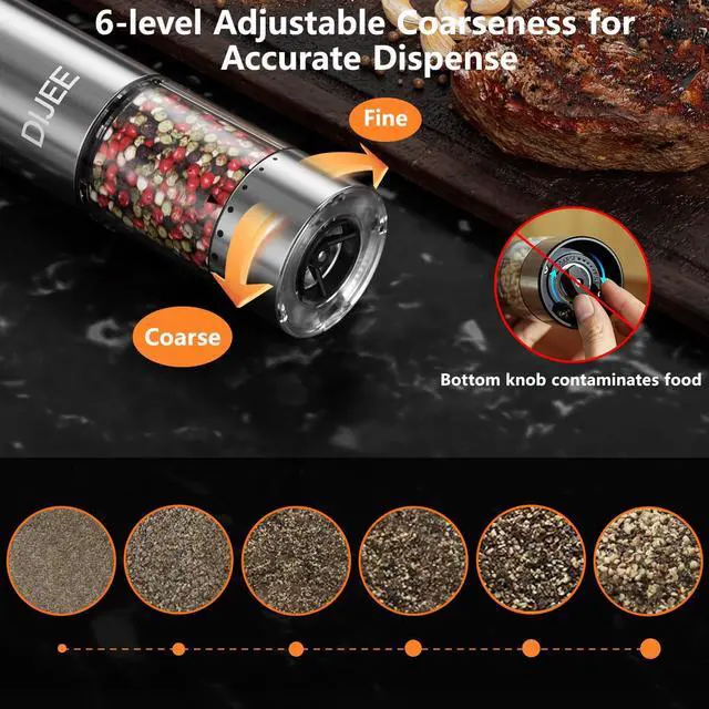 Innovative External Coarseness Adjustment for Clean and Convenient Grinding: The electric salt and pepper grinder has been upgraded to say goodbye to messy internal adjustments and customize your grind in a cleaner and more hygienic way. The salt and pepper grinder has an innovative external coarseness adjustment mechanism that allows you to easily adjust the desired coarseness without touching the salt and pepper. This keeps your hands clean and does not contaminate the pepper or salt during use