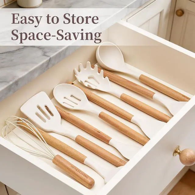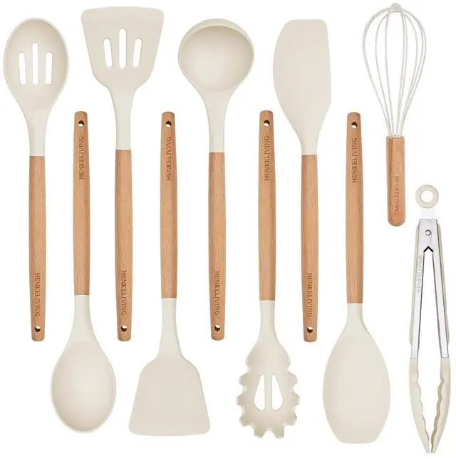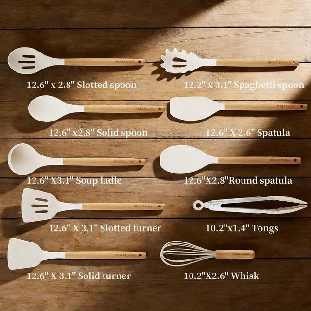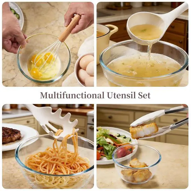 Complete 10-Piece Set: Includes spatula, round spatula, solid spatula, slotted spatula, slotted spoon, solid spoon, soup ladle, pasta server, tongs, and whisk. Covers all your everyday cooking needs while being gentle on non-stick pansno scratches!