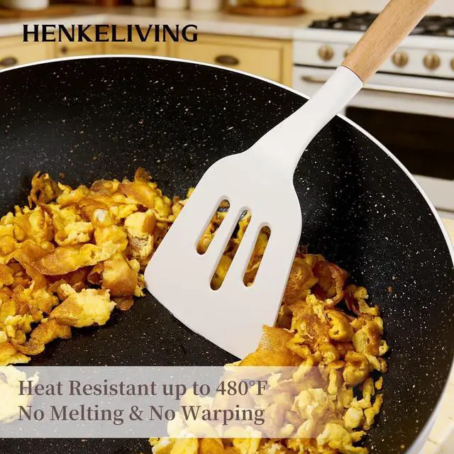 High-Heat Safe Up to 480°F: Handles searing, frying, and high-temp cooking without melting. Natural wooden handles stay cool, provide a comfy non-slip grip, and protect hands from burns.
