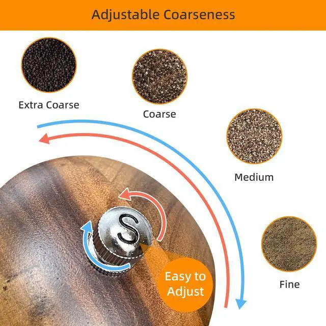 Non-slip turning knob rotates to adjust salt mill and pepper grinder setting from fine to coarse(Counterclockwise represents coarse,Clockwise represents fine).Simple knob design makes it easy for you to fill, disassemble, and clean.
