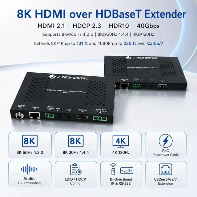 ![Main image of J-Tech Digital 8K HDMI Extender over HDBaseT, 8K@30Hz 4:4:4, 4K@120Hz, HDR10, HDCP 2.3, IR & RS232, PoC, up to 131ft/40m over Cat6a/7 [JTECH-EX8K30-35M]](https://c1.neweggimages.com/productimage/nb640/AAFFS260424147SPYE8.jpg)