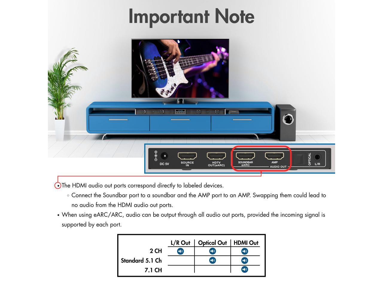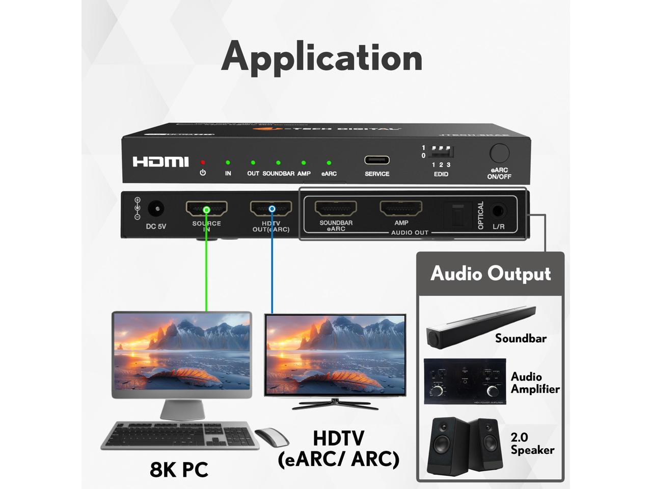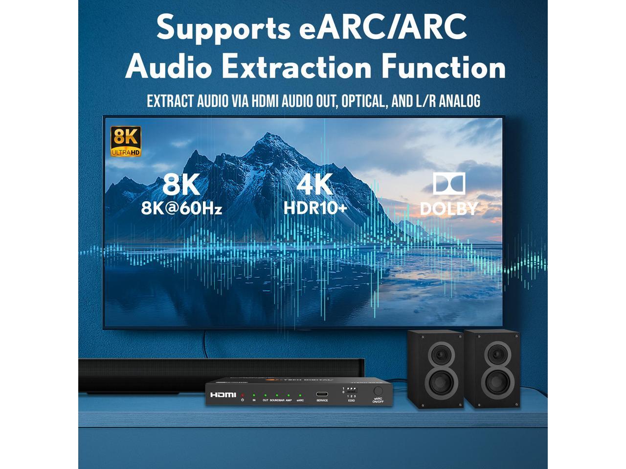- Extract audio from an incoming HDMI signal, and send to an external sound system via Optical, L/R, or 2 x HDMI audio outputs. Supports up to 8K@60Hz, 4K@120Hz video resolution pass-through Features eARC / ARC audio extraction function.