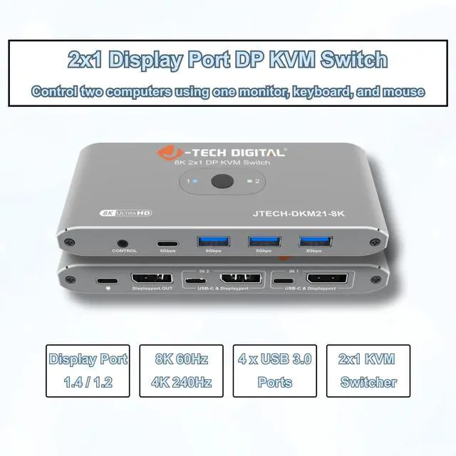 ![Main image of J-Tech Digital 8K DisplayPort 1.4 KVM Switch 2 Computers 1 Monitor, 8K@60Hz / 4K@240Hz Dual PC DP KVM Switcher with 4 USB 3.0 Ports (3 USB-A + 1 USB-C), Includes DP & USB Cables [JTECH-DKM21-8K]](https://c1.neweggimages.com/productimage/nb640/AAFFS26030514NAM07C.jpg)
