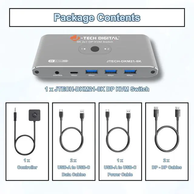 ![Alt view image 7 of 7 - J-Tech Digital 8K DisplayPort 1.4 KVM Switch 2 Computers 1 Monitor, 8K@60Hz / 4K@240Hz Dual PC DP KVM Switcher with 4 USB 3.0 Ports (3 USB-A + 1 USB-C), Includes DP & USB Cables [JTECH-DKM21-8K]](https://c1.neweggimages.com/productimage/nb640/AAFFS26030514NM9Q79.jpg)