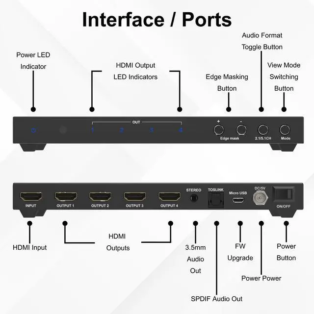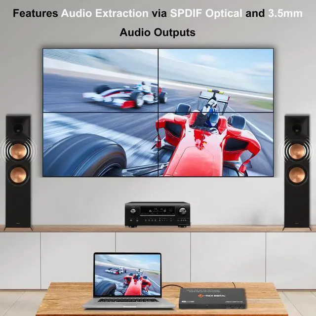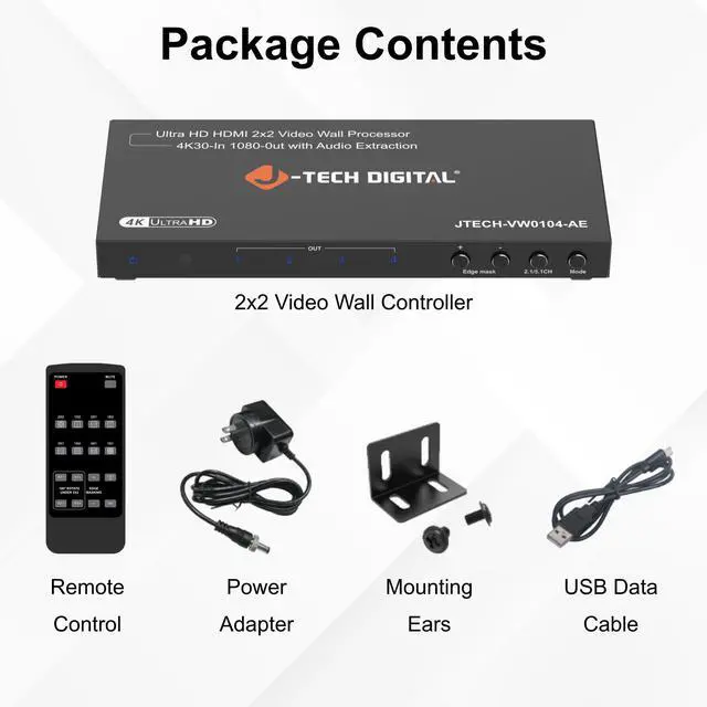 Introducing the JTECH- VW0104-AE; 4K 2x2 Video Wall Processor. This is a powerful HDMI video wall controller that combines up to four displays into one seamless large-format screen. Supporting 4K@30Hz input and Full HD 1080p outputs, this versatile controller offers 8 dynamic display modes including 2x2, 1x2, 2x1, 1x3, 3x1, 1x4, and more perfect for digital signage, home theaters, control rooms, and commercial displays. Enjoy immersive sound with built-in audio extraction, featuring SPDIF Optical (5ch) and 3.5mm (2ch) outputs for connecting to external speakers or sound systems. Fine-tune your setup with advanced image rotation (up to 180°) and edge masking functions to eliminate bezel gaps and distortion for a flawless, professional display. Whether youre building a multi-screen video wall or using splitter mode, this HDMI video wall controller delivers crystal-clear visuals, flexible configurations, and premium audio performance for any setup.