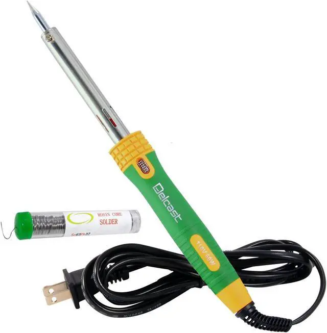 Delcast 60 Watt Precision Tip Soldering Iron is ideal for electronics repair, workshop, hobby and general home improvement projects. It features a power indicator light, robust stress relief and replaceable tip. It quickly heats to working temperature and has an insulated handle that is comfortable to hold and remains cool remains cool during prolonged use. Includes one 12.5 g tube of 0.8 mm rosin core 63/37 tin lead solder wire. Solder comprised of 63% to 37% lead has the lowest melting point of any tin lead solder mixed at a different ratio.