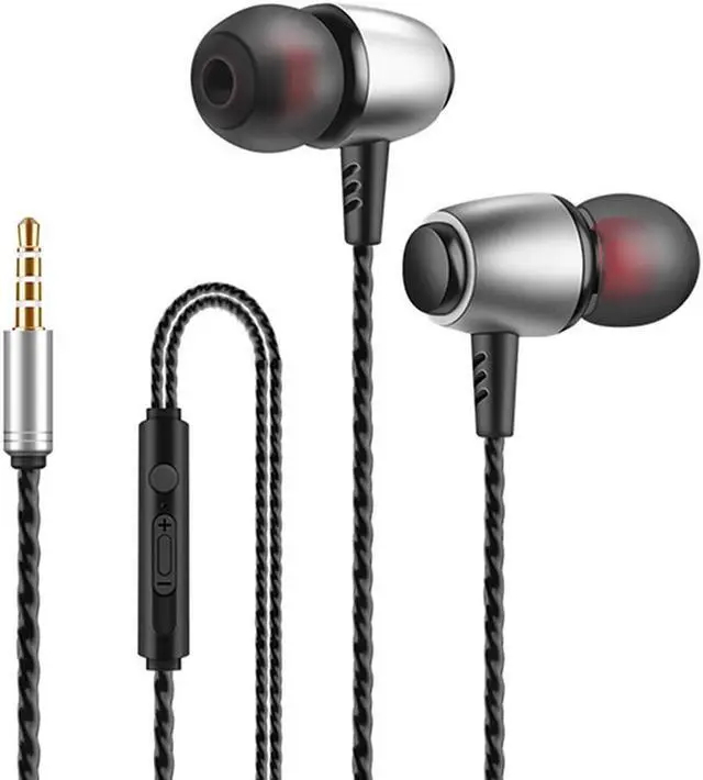Features include an on-cable microphone, a control button, and an analog volume adjustment slider
