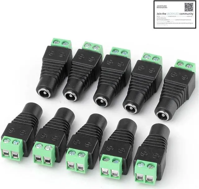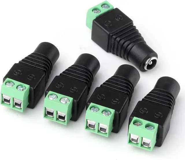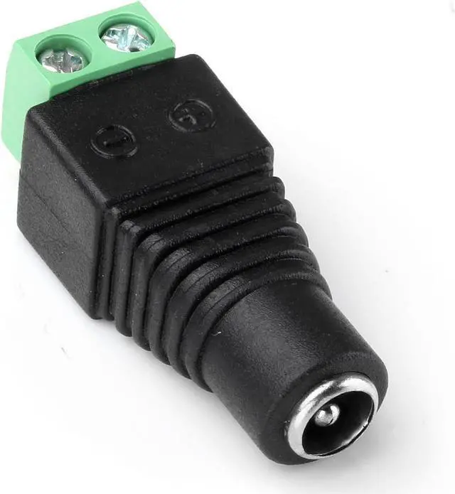 These 5.5 mm x 2.1 mm female DC jack power connector plugs can be used for LED lighting, CCTV, and various electronics. This barrel connector is the most common connector used for 12V and 24V DC power. Simply loosen screws, insert wire, and twist the screws shut using a screwdriver. No electrical tape, no splicing, and no crimping required.