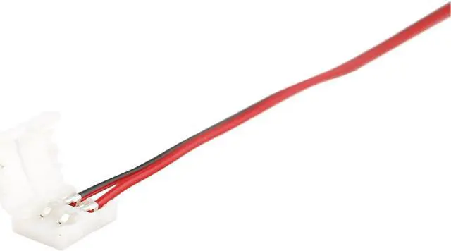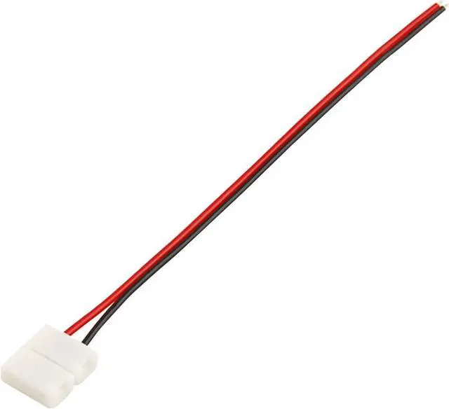 10mm solderless 2-wire connectors eliminate the need for soldering when installing LED strip lighting. Open the top of the connector, insert the raw strip into the connector and under the pins then snap shut. Now the strip is terminated with wires. Connect it to a power source or extend power to the another strip, the options are limitless now that you have familiar wires to work with. 10mm 2-conductor strips are normally used with single-color SMD5050 chips.