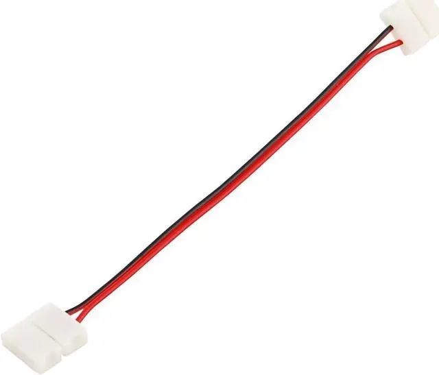 10mm 2-pin solderless flexible couplers allow you to easily connect two 10mm LED strip lights together with flexible wire between the strips. Cut and reconnect strips with these couplers to perfectly fit contours and corners for a professional look. Open the tops of the connectors and insert the strips into the connector and under the pins. Simply close the tops and it's done. 10mm 2-wire strips are normally used with single-color SMD5050 chips.