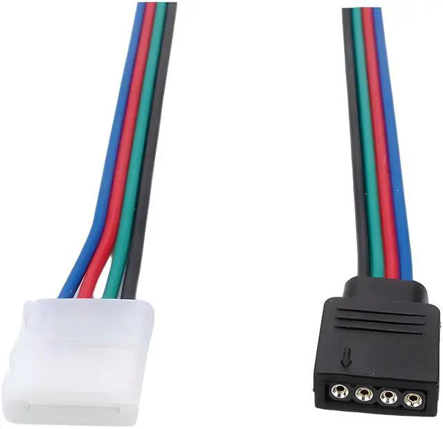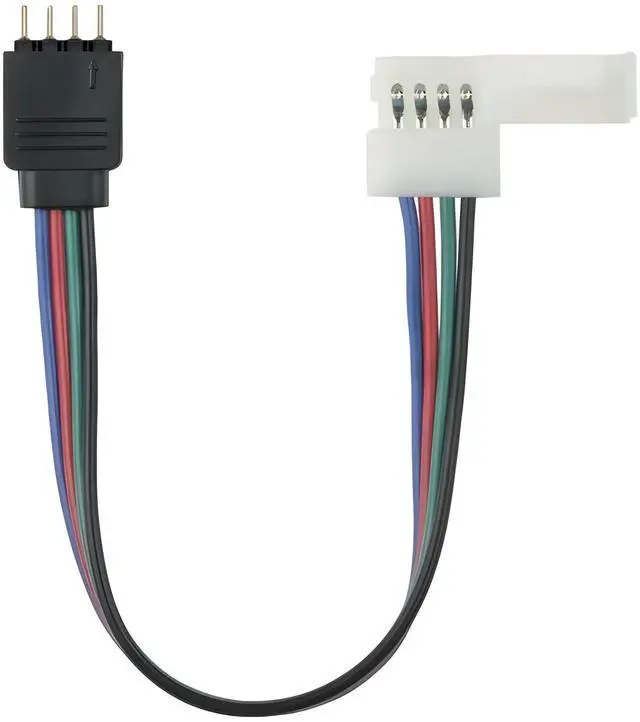 These 6-inch 4-wire cables have 10mm solderless connectors on one end and 4-pin connectors on the other end. Use them to terminate RGB color changing strip lights. The 4-pin connector is used by many controllers, splitters, and amplifiers. 10mm 4-conductor strips are normally used with SMD 5050 color changing RGB chips.