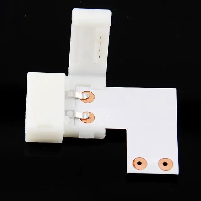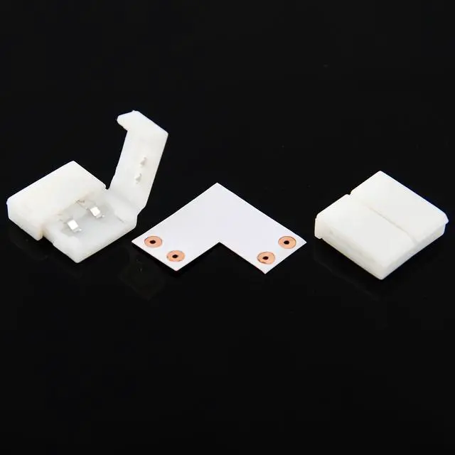 10mm 2-pin L-shaped solderless couplers allow you to easily connect two pieces of 10mm LED strip light together at a right angle. This gives you much more control over where the light goes as you're no longer bound to straight-line applications. Open the tops of the connectors and insert the strips into the connector and under the pins. Simply close the tops and it's done. 10-mm 2-conductor strips are normally used with single-color SMD5050 chips. Each L-shaped PCB strip comes with two solderless coupler clips.