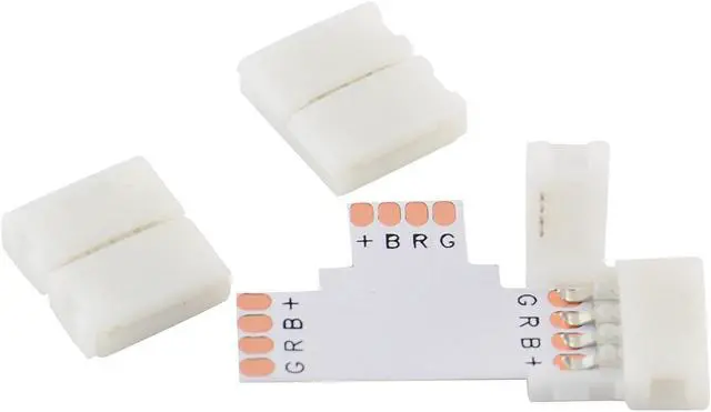 10mm 4-pin T-shaped solderless connectors allow you to connect three pieces of RGB LED strip light together. This gives you much more control over where the light goes as you're no longer bound to straight-line applications. Open the tops of the connectors and insert the strips into the connector and under the pins. Simply close the tops and it's done. 10-mm 4-conductor strips are normally used with RGB chips. Each T-shaped PCB strip comes with three solderless coupler clips.
