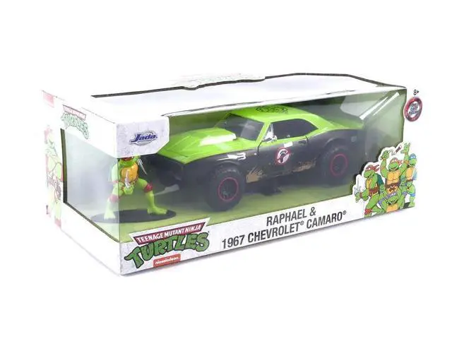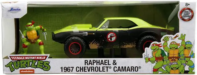 Cowabunga! Relive Turtle Time through this Hollywood Ride. Raphael has inspired this 1967 Chevy Camaro and you can add it to your collection. This die-cast ride was made for Raphael as it features iconic logos, decals, splash graphics, and Raphael's signature blade detail. Designed with precision, using quality heavy die-cast metal, the vehicle features working wheels, premium rubber tires, opening hood, doors, and trunk and a 100% 2.75" die-cast Raphael figure. Collect all TMNT Hollywood Rides.