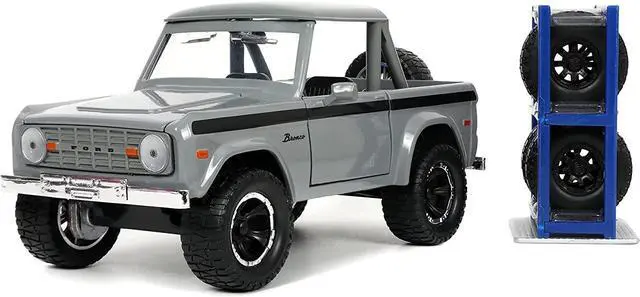 Brand new 1/24 scale diecast car model of 1973 Ford Bronco Pickup Truck Gray with Black Stripes with Extra Wheels "Just Trucks" Series die cast model car by Jada.