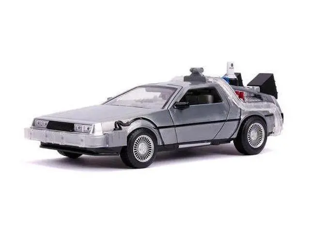 Brand new 1/24 scale diecast car model of DeLorean Brushed Metal Time Machine with Lights (Flying Version) "Back to the Future Part II" (1989) Movie "Hollywood Rides" Series die cast model car by Jada.