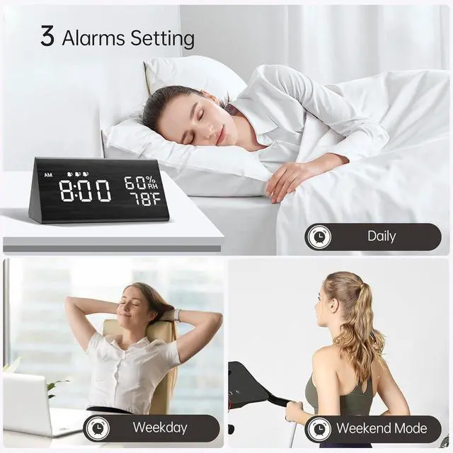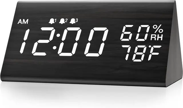 Digital Alarm Clock, with Wooden Electronic LED Time Display, 3 Alarm Settings, Humidity & Temperature Detect, Wood Made Electric Clocks for Bedroom, Bedside (Black)